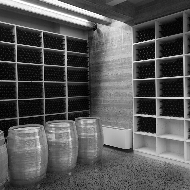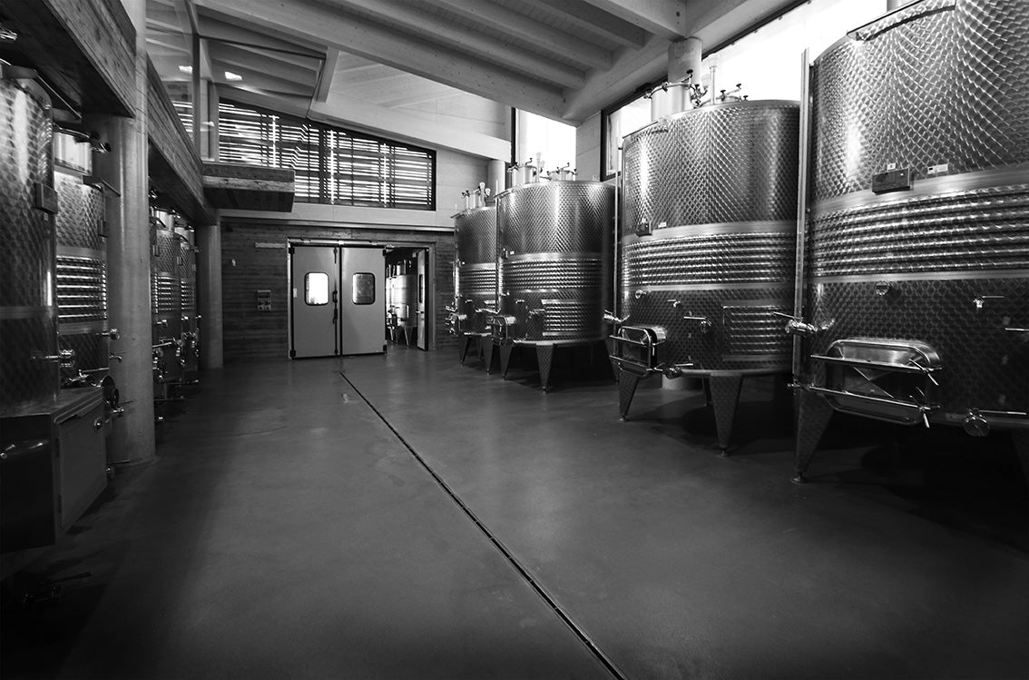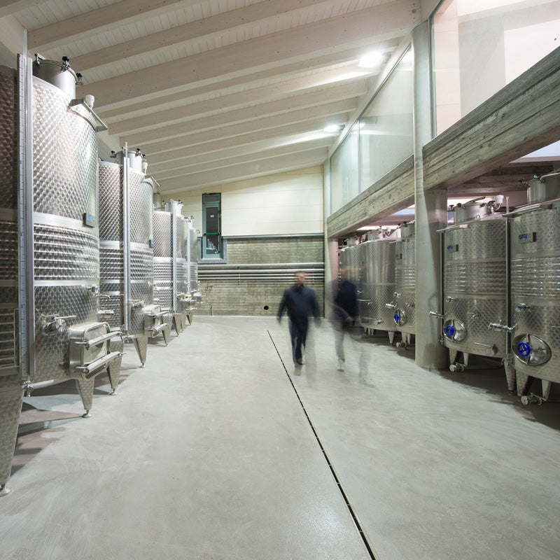 Al piano interrato vi è la zona produzione, con i fermentini e i serbatoi in acciaio collegati agli impianti di controllo della temperatura. In un apposito spazio coibentato e protetto contro-terra c’è la barricaia, dove il vino viene tenuto in affinamento prima dell’imbottigliamento. Nella zona enoteca-bottiglieria vengono conservate le diverse annate dei nostri prodotti. Gli spazi del piano terra, invece, si snodano attraverso una sequenza dinamica e servono una serie di funzioni: all’accoglienza dei clienti, parte integrante dell’attività aziendale, ai servizi, alla direzione aziendale.